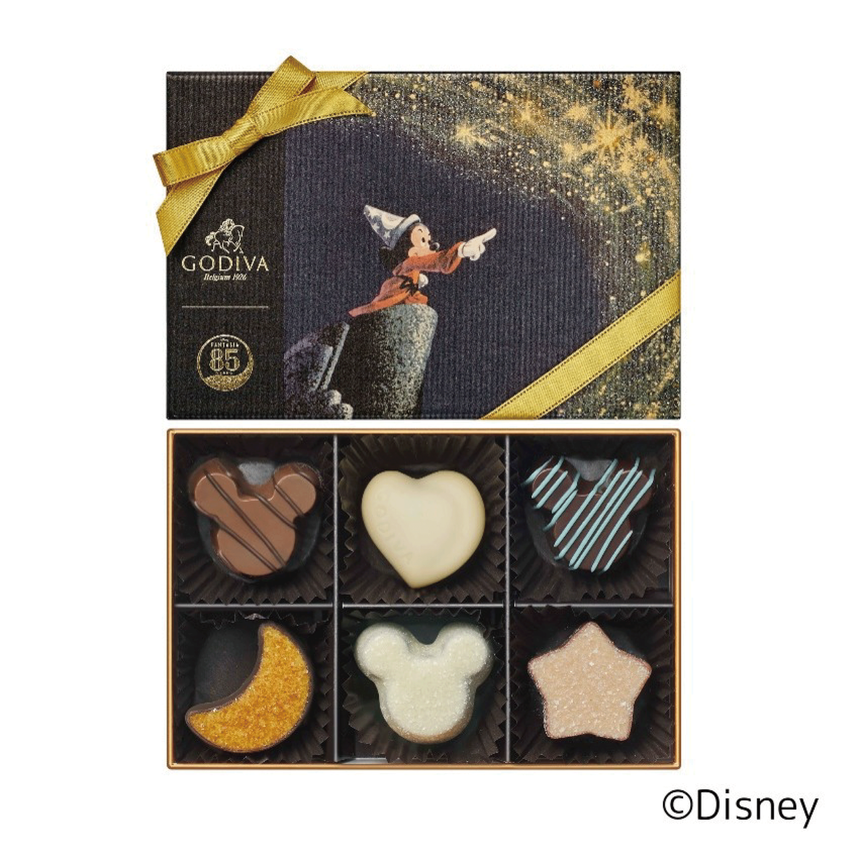 『ファンタジア』の1シーンをデザインしたパッケージに、ミッキーのアイコンをかたどった3種類の限定チョコレートと、星や月の形のチョコレートなどの詰合せ。