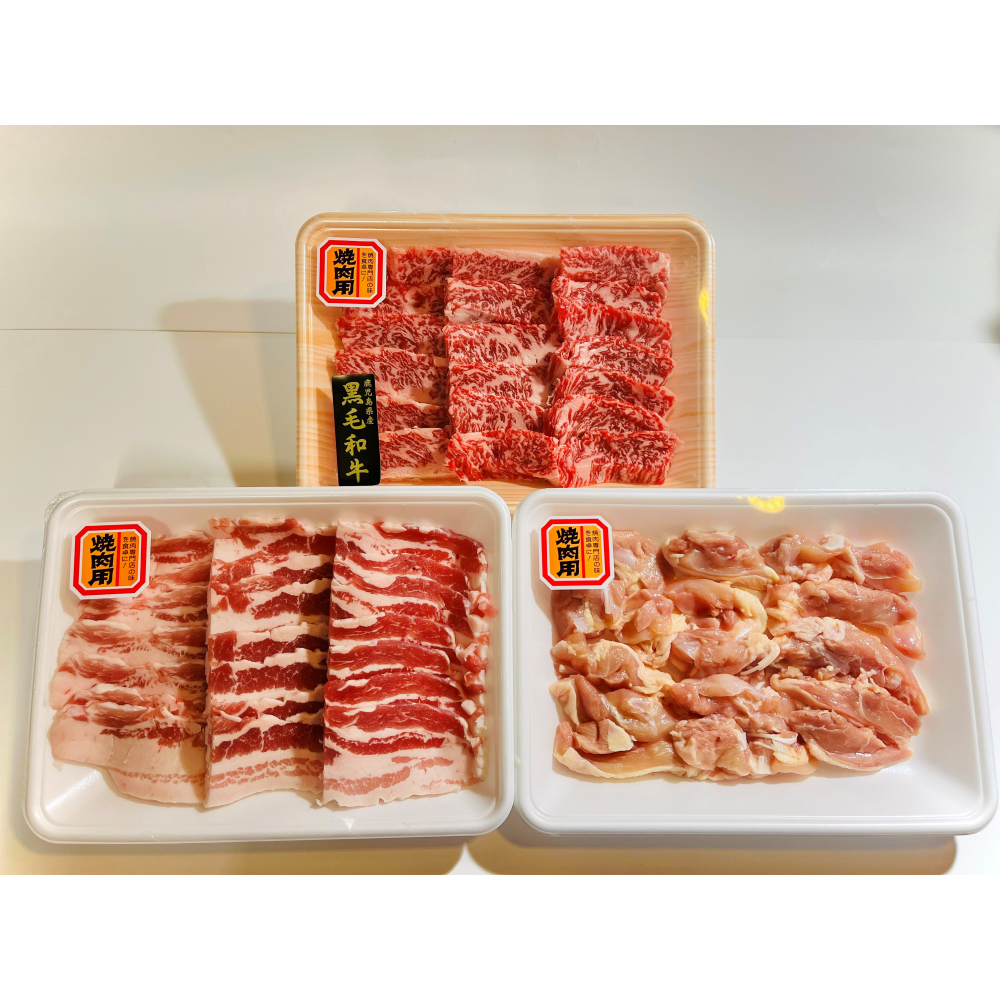 鹿児島県産黒毛和牛バラ 400g、国産豚バラ・鶏もも 各400g