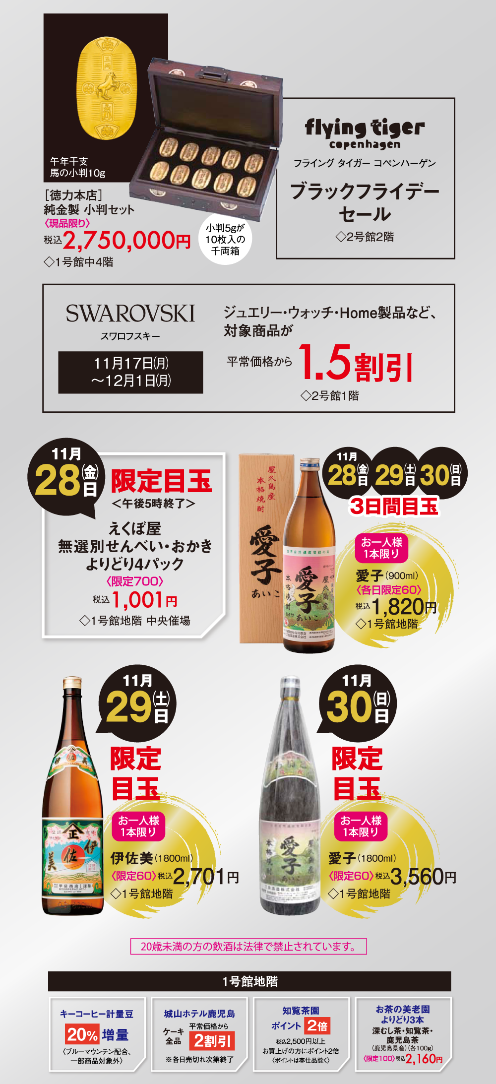 EVENT【1号館】7階ななテラスギャラリー、6階 大催場・南催場、5階 STAGE105、3階 STAGE103、1階 STAGE101、【2号館】6階 山形屋文化ホール、1階 中央玄関横 イベント広場、天文館ベルク広場(山形屋2号館横 ゼッテリア前広場)