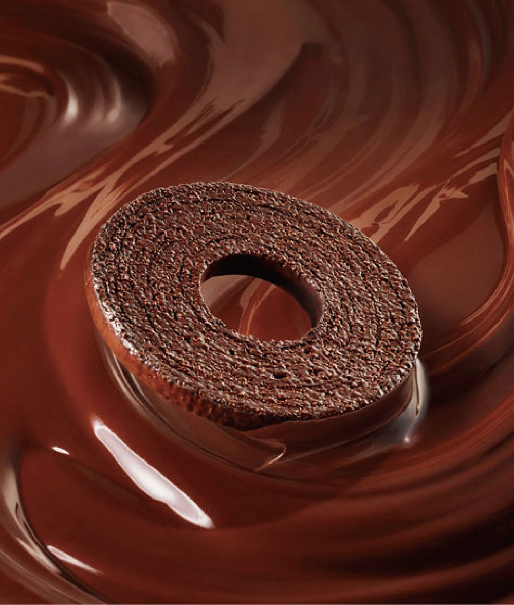 バームクーヘンを使った待望の新定番。バームクーヘンの風味を大切に、数種類をブレンドしたショコラをほどよく染み込ませました。