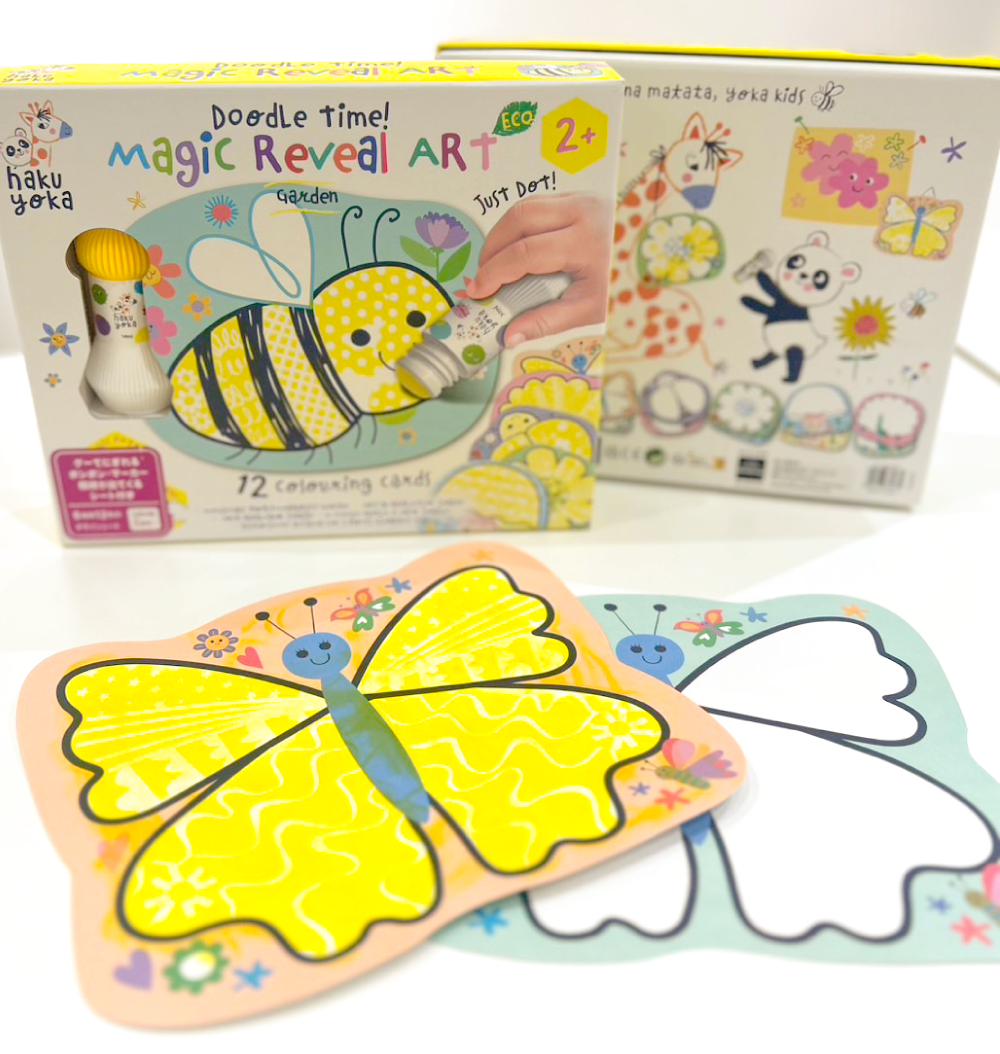 小さな手でもグーにして握りやすく、スタンプのように押せる水性スタンプ・マーカー1色(黄色)と、ポンポンと押すと模様が表れる6種類のデザインシート(12枚入り)ギフトセット。