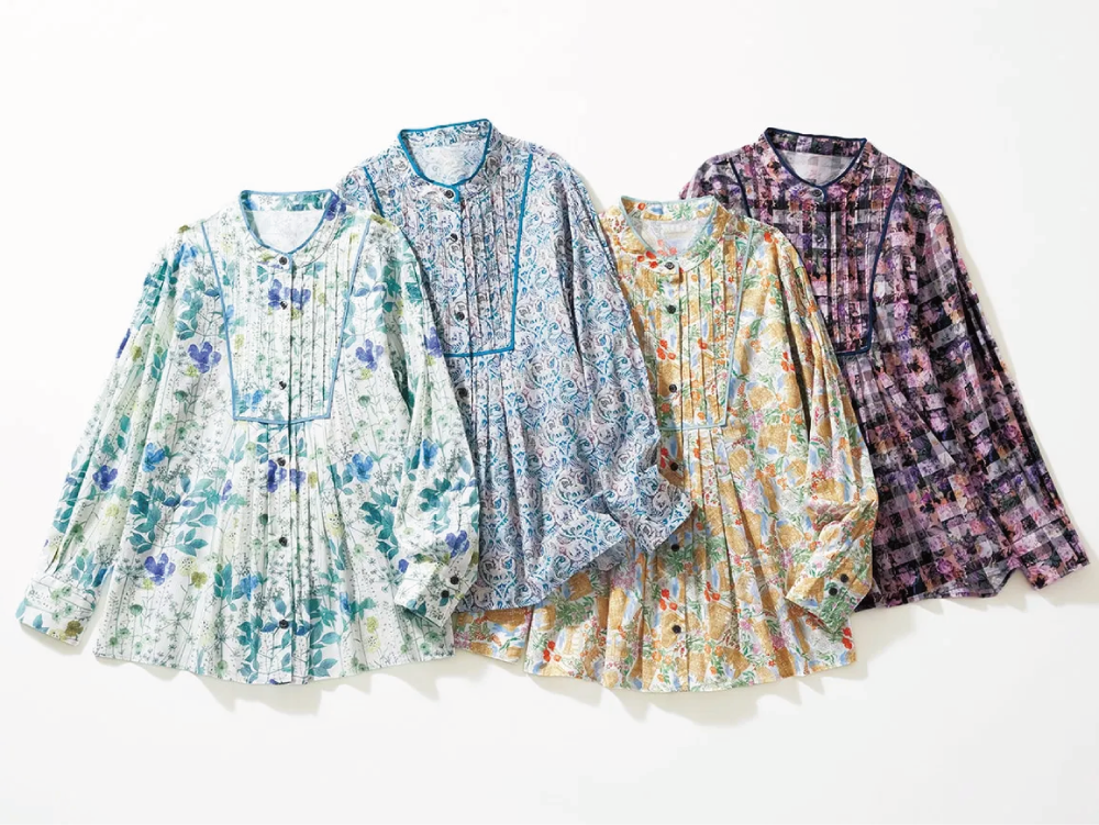 繊細なタッチと顔なじみのよい色を中心に、華やかながら派手すぎない、大人にこそ似合う柄を厳選。襟や身ごろに柄と同色のステッチを入れ、印象的に仕立てました。
