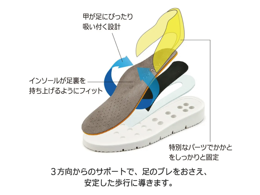 ●アーチサポート入り。甲まわりが固定され歩きやすい。外反母趾の方にもおすすめです。