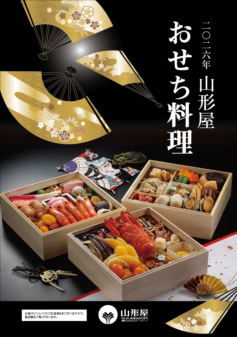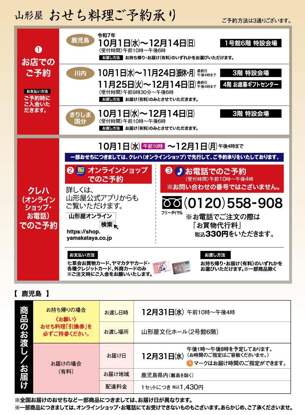 TOP きりしま国分山形屋 イベント 2026年 山形屋おせち料理 EVENTイベント ALL 11/25(火) 11/26(水) 11/27(木) 11/28(金) 11/29(土) 11/30(日) 12/1(月) 12/2(火) 12/3(水) 12/4(木) 12/5(金) 12/6(土) 12/7(日) 12/8(月) 2026年 山形屋おせち料理 シェア Tweet ●承り中!12月14日(日)まで〈受付時間〉午前10時~午後6時 / きりしま国分山形屋 3階 特設会場 ●クレハ(オンラインショップ・お電話) 承り中!12月1日(月)午後4時まで 山形屋オンラインショップはこちら ※画像はイメージです。 山形屋おせち料理お問い合わせ 令和7年10月1日(水)~12月31日(水) 【受付時間:午前10時~午後6時】 フリーダイヤル (0120)51-5115 令和8年1月1日(元日)は店休日のため 山形屋宿直室へ (099)227-6118 令和8年1月2日(金)以降 [午前10時~午後7時] 食品事務所へ (099)227-6387 イベント一覧