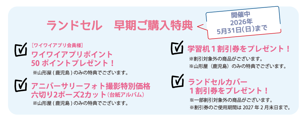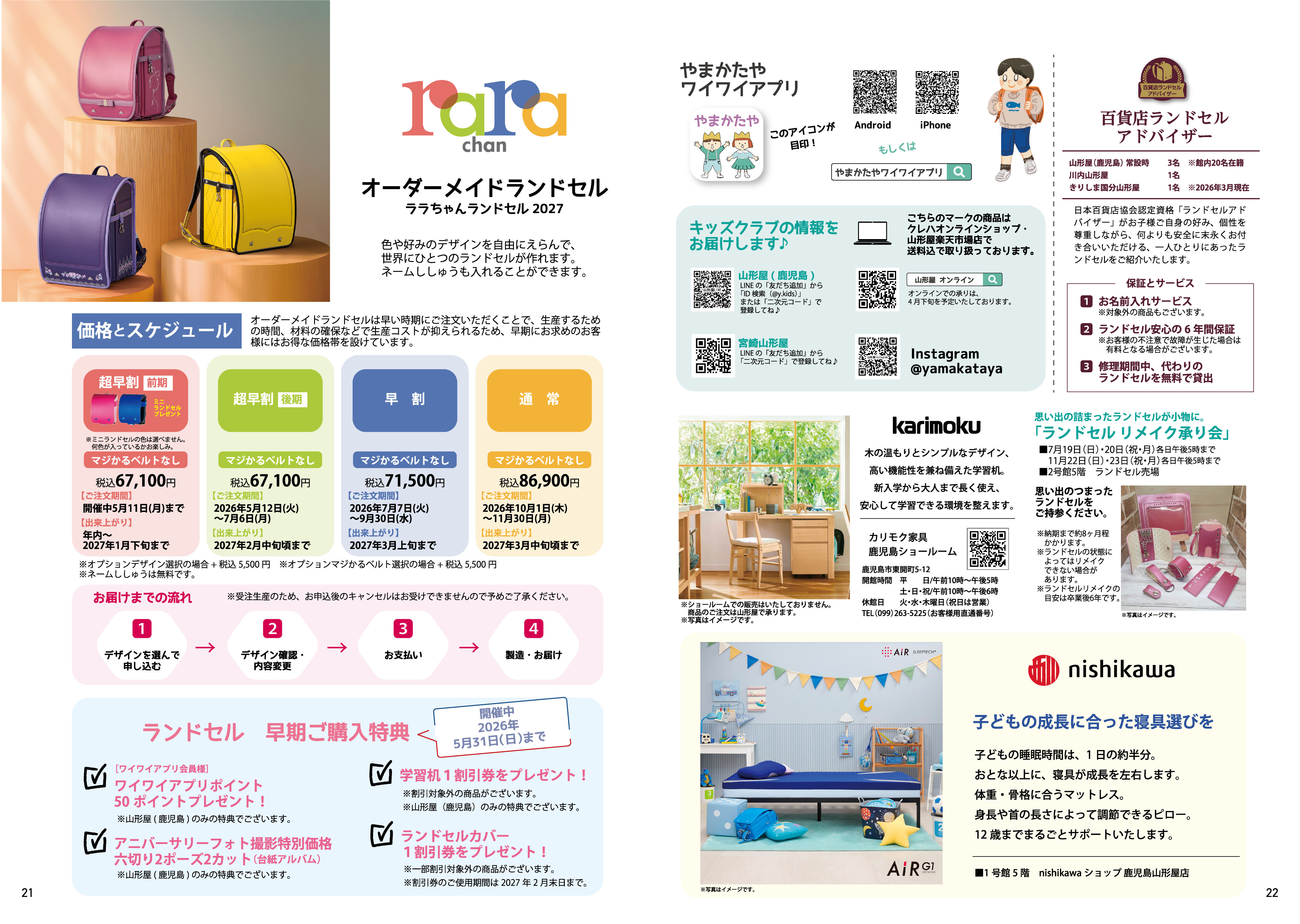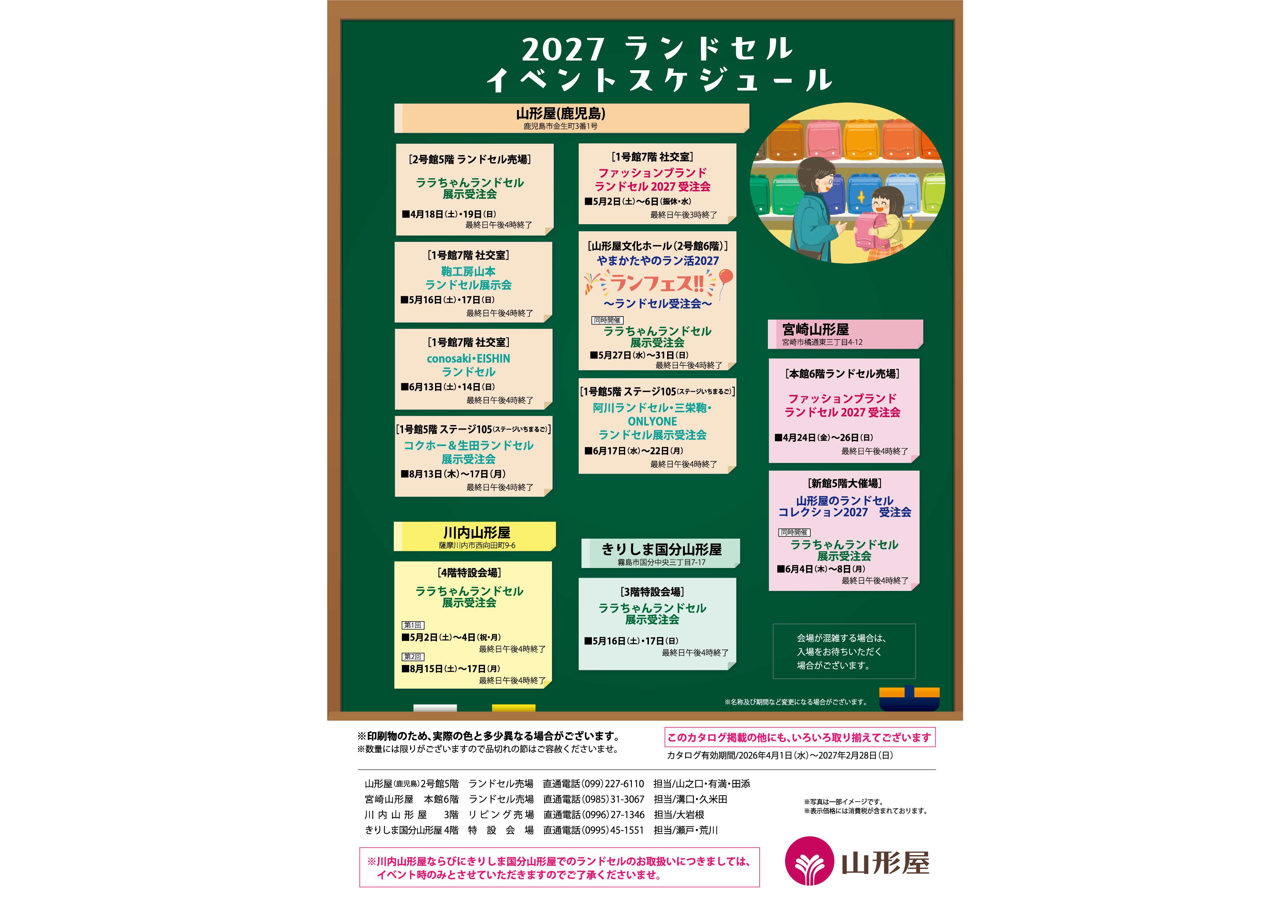 詳しくは、最下部【山形屋のランドセルカタログ 2027】画像最後に掲載の【2027 ランドセル イベントスケジュール】をご覧くださいませ。