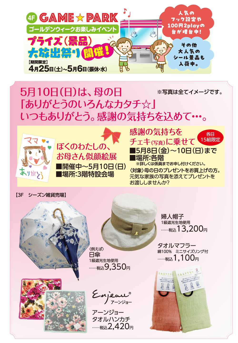 TOP きりしま国分山形屋 イベント GWカーニバル EVENTイベント ALL 4/18(土) 4/19(日) 4/20(月) 4/21(火) 4/22(水) 4/23(木) 4/24(金) 4/25(土) 4/26(日) 4/27(月) 4/28(火) 4/29(祝・水) 4/30(木) 5/1(金) GWカーニバル シェア Tweet 4月24日(金)~5月6日(振休・水) きりしま国分山形屋 各階 チラシはこちら![2ページ、PDF/2.58MB] イベント一覧
