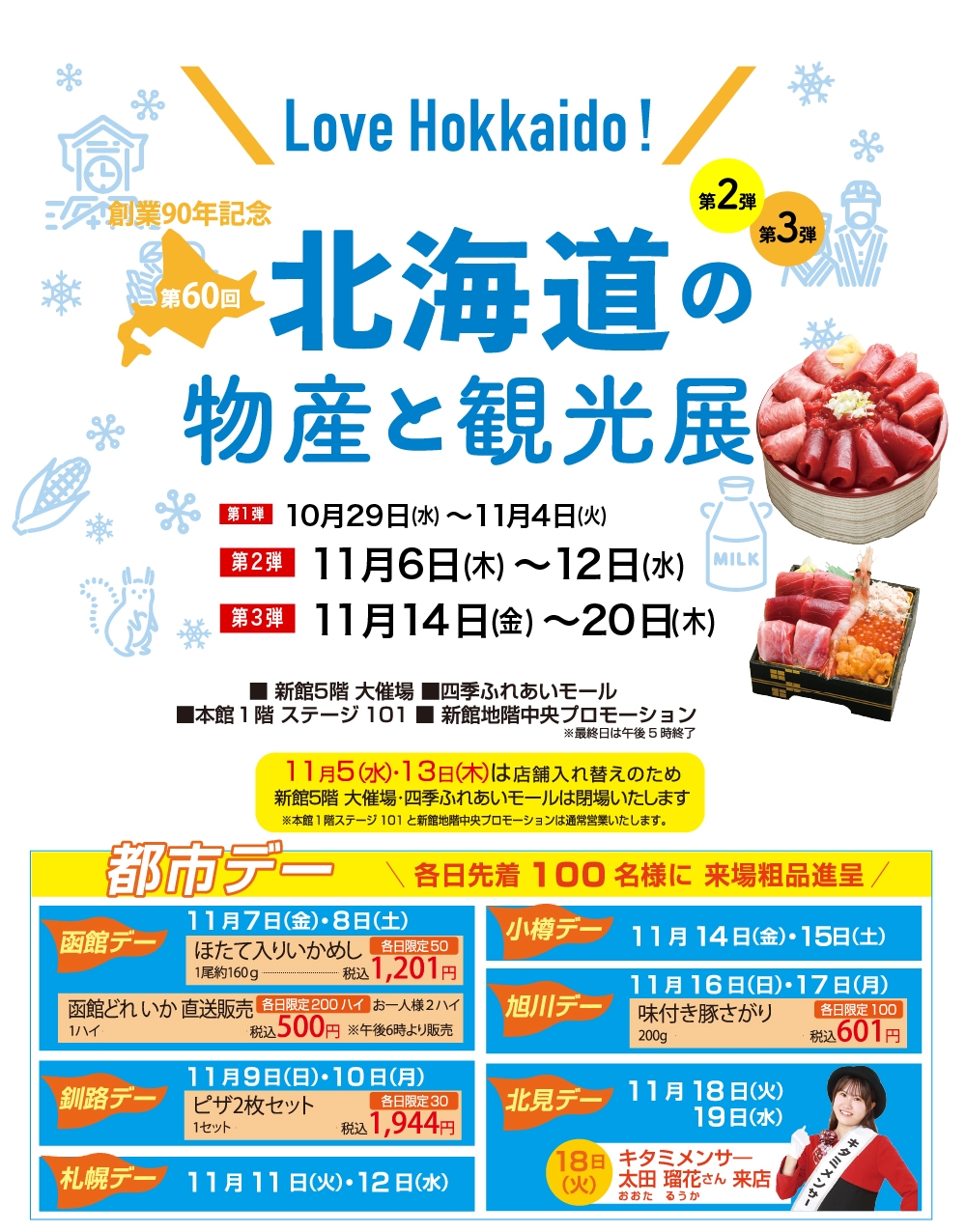 TOP 宮崎山形屋 【本館】1階STAGE101、【新館】5階大催場 創業90年記念 北海道の物産と観光展第2弾・第3弾 EVENT【本館】1階STAGE101、【新館】5階大催場 ALL 10/30(木) 10/31(金) 11/1(土) 11/2(日) 11/3(祝・月) 11/4(火) 11/5(水) 11/6(木) 11/7(金) 11/8(土) 11/9(日) 11/10(月) 11/11(火) 11/12(水) 創業90年記念 北海道の物産と観光展第2弾・第3弾 シェア Tweet 11月6日(木)~20日(木) 宮崎山形屋 新館5階大催場 / 本館1階ステージ101 / 新館地階中央プロモーション / 四季ふれあいモール チラシはこちら♪[1ページ、PDF/3.27MB] ※画像はイメージです。 イベント一覧