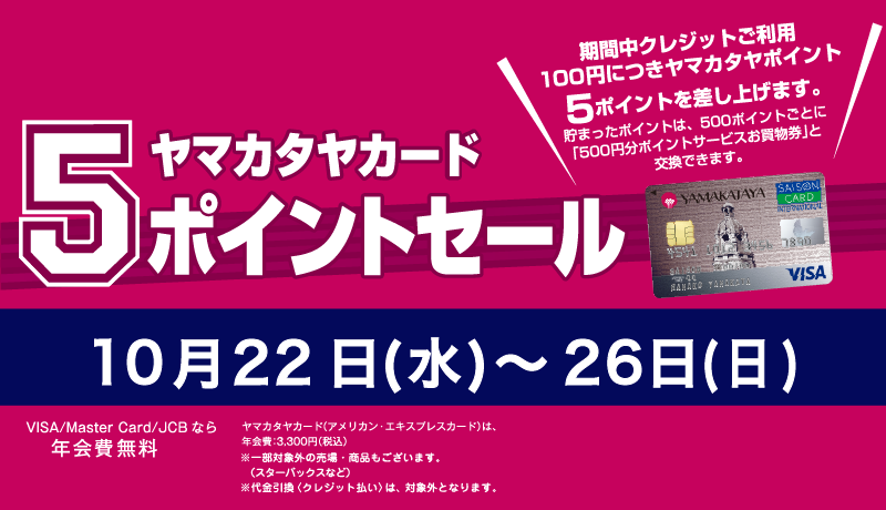 TOP 宮崎山形屋 【本館】1階STAGE101、【新館】5階大催場 ヤマカタヤカード 5ポイントセール EVENT【本館】1階STAGE101、【新館】5階大催場 ALL 10/23(木) 10/24(金) 10/25(土) 10/26(日) 10/27(月) 10/28(火) 10/29(水) 10/30(木) 10/31(金) 11/1(土) 11/2(日) 11/3(祝・月) 11/4(火) 11/5(水) ヤマカタヤカード 5ポイントセール シェア Tweet 開催中!10月26日(日)まで 宮崎山形屋 全館 VISA / Master Card / JCB なら 年会費無料 ヤマカタヤカード(アメリカン・エキスプレス・カード)は年会費:3,300円(税込) ヤマカタヤカードのご案内 イベント一覧