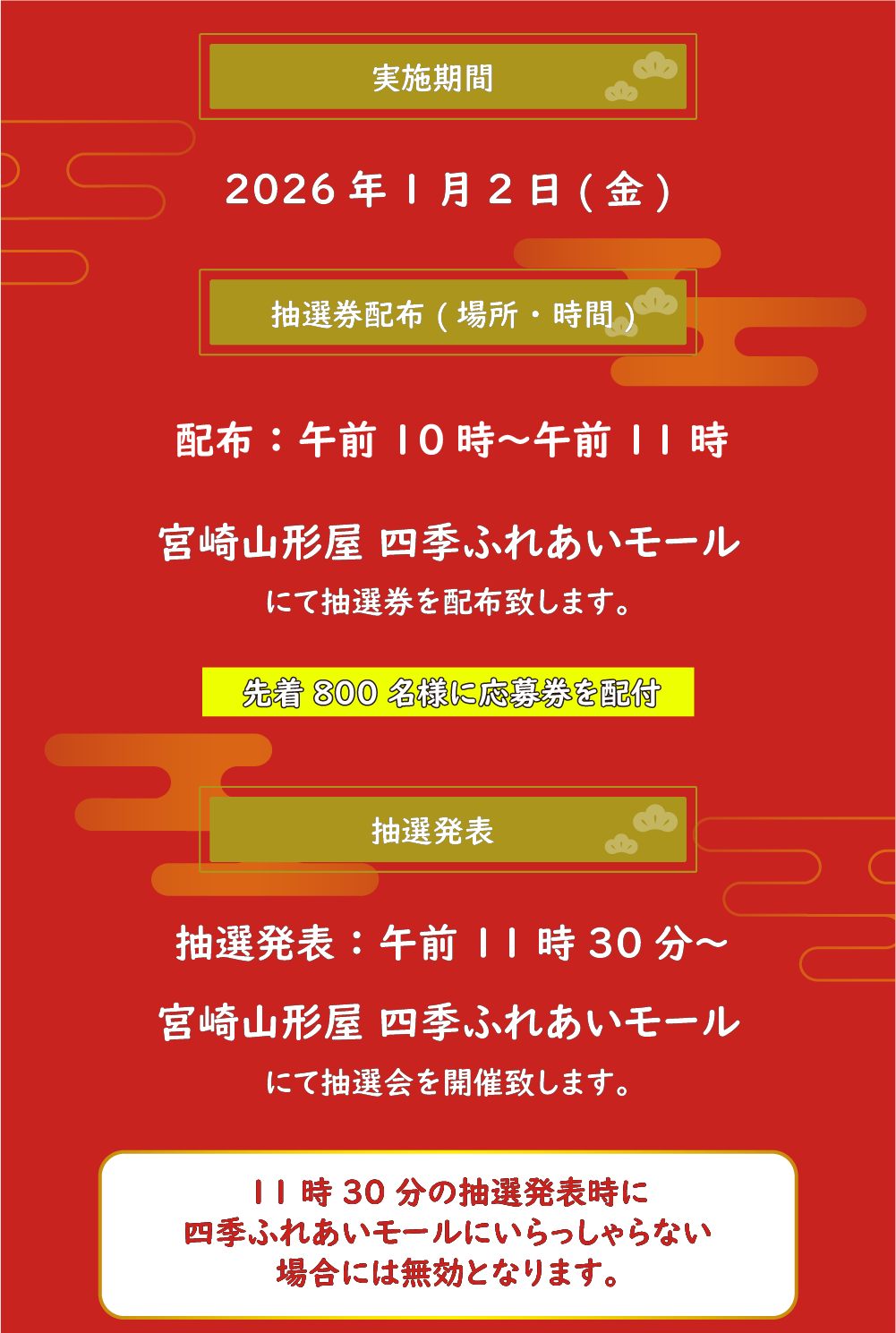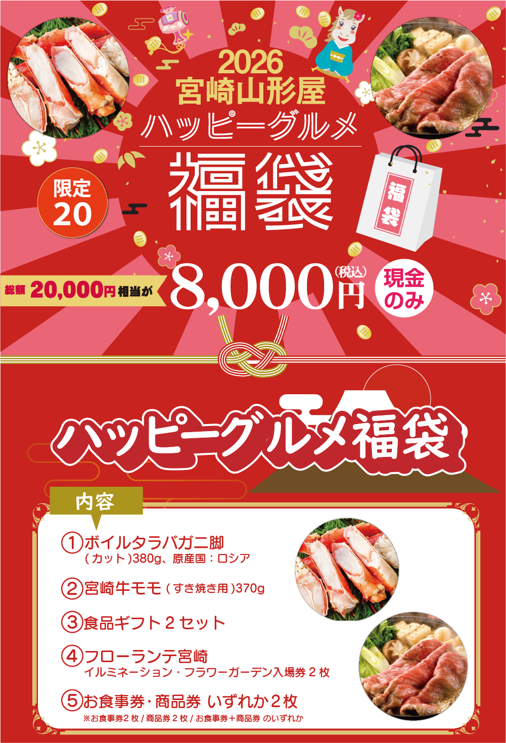 TOP 宮崎山形屋 【本館】1階STAGE101、【新館】5階大催場 2026 宮崎山形屋 ハッピーグルメ福袋 EVENT【本館】1階STAGE101、【新館】5階大催場 ALL 12/24(水) 12/25(木) 12/26(金) 12/27(土) 12/28(日) 12/29(月) 12/30(火) 12/31(水) 1/1(木) 1/2(金) 1/3(土) 1/4(日) 1/5(月) 1/6(火) 2026 宮崎山形屋 ハッピーグルメ福袋 シェア Tweet 2026年1月2日(金) 【配布:午前10時~午前11時】【抽選発表:午前11時30分から】 宮崎山形屋 四季ふれあいモール ※画像はイメージです。 イベント一覧
