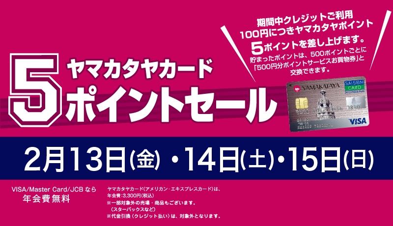 TOP 宮崎山形屋 【本館】1階STAGE101、【新館】5階大催場 ヤマカタヤカード5ポイントフェア EVENT【本館】1階STAGE101、【新館】5階大催場 ALL 2/13(金) 2/14(土) 2/15(日) 2/16(月) 2/17(火) 2/18(水) 2/19(木) 2/20(金) 2/21(土) 2/22(日) 2/23(祝・月) 2/24(火) 2/25(水) 2/26(木) ヤマカタヤカード5ポイントフェア シェア Tweet 2月13日(金)・14日(土)・15日(日) 宮崎山形屋 全館 VISA / Master Card / JCB なら 年会費無料 ヤマカタヤカード(アメリカン・エキスプレス・カード)は年会費:3,300円(税込) ヤマカタヤカードのご案内 イベント一覧