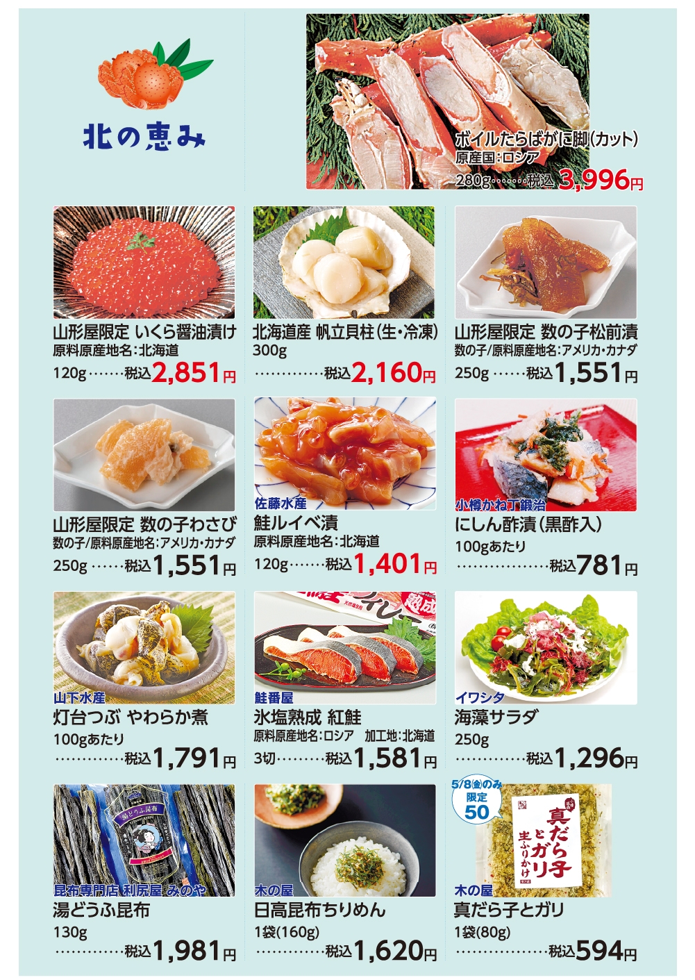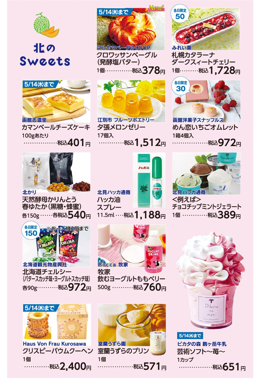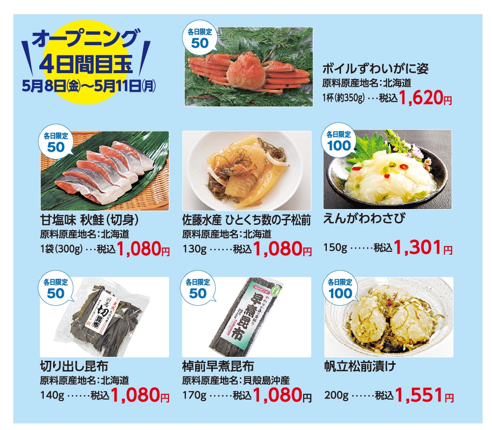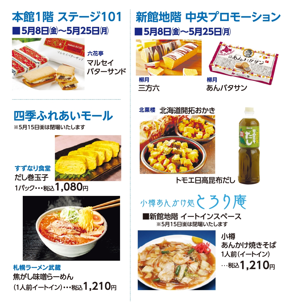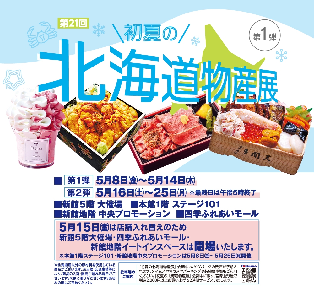 TOP 宮崎山形屋 【本館】1階STAGE101、【新館】5階大催場 第21回 初夏の北海道物産展 第1弾 EVENT【本館】1階STAGE101、【新館】5階大催場 ALL 4/29(祝・水) 4/30(木) 5/1(金) 5/2(土) 5/3(祝・日) 5/4(祝・月) 5/5(祝・火) 5/6(振休・水) 5/7(木) 5/8(金) 5/9(土) 5/10(日) 5/11(月) 5/12(火) 第21回 初夏の北海道物産展 第1弾 シェア Tweet 5月8日(金)~14日(木) 宮崎山形屋 新館5階 大催場、本館1階 ステージ101、新館地階 プロモーション、四季ふれあいモール イベント一覧