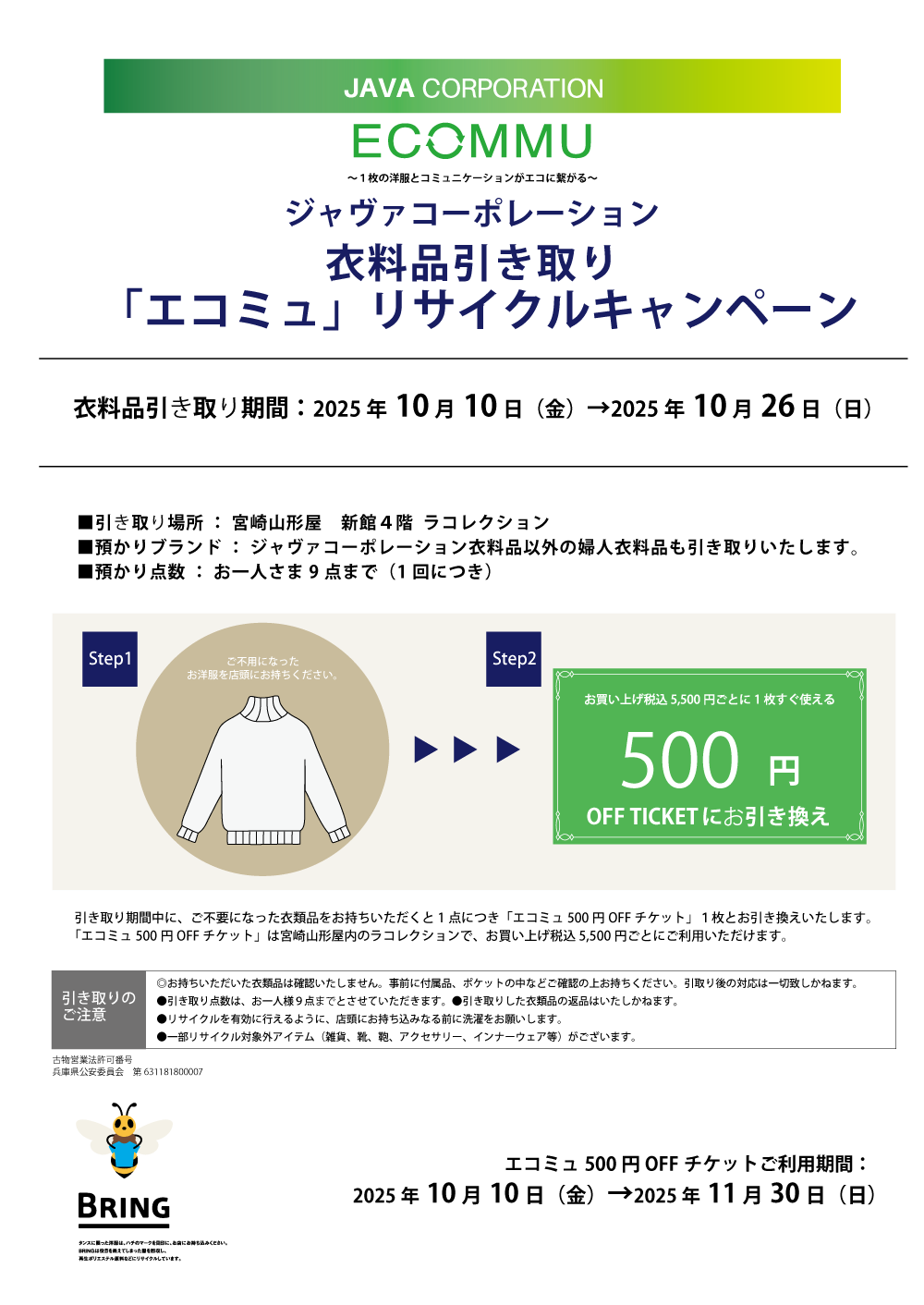 お引き取り期間中に、ジャヴァコーポレーション製品、および他社婦人服の衣料品回収1点につき、
