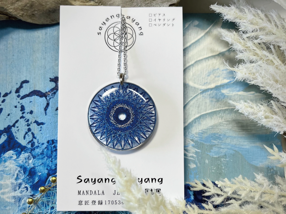 糸かけ曼荼羅の技法で、1つ1つ丁寧に糸を掛けて作った、sayang sayangオリジナルペンダント。