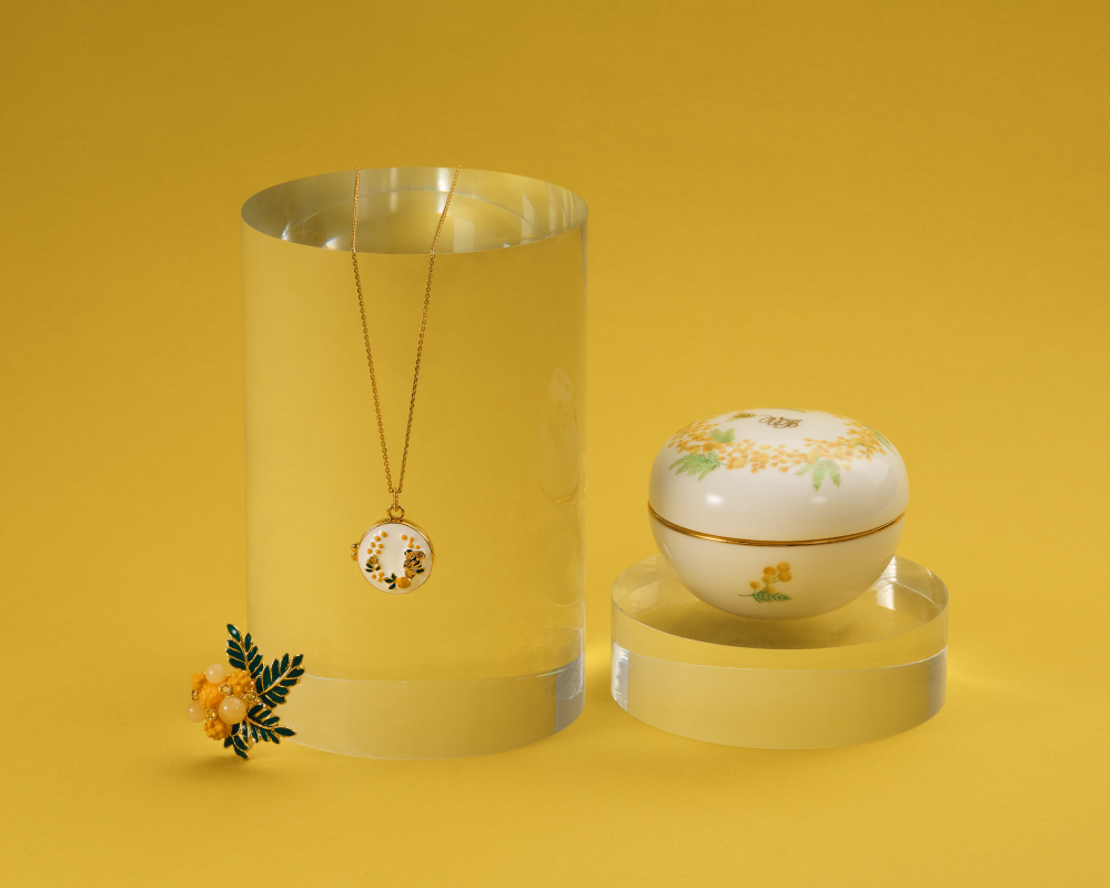 色鮮やかなミモザのアクセサリーとノリタケの”ボンボニエール”がセットになったスペシャルなアイテムは、