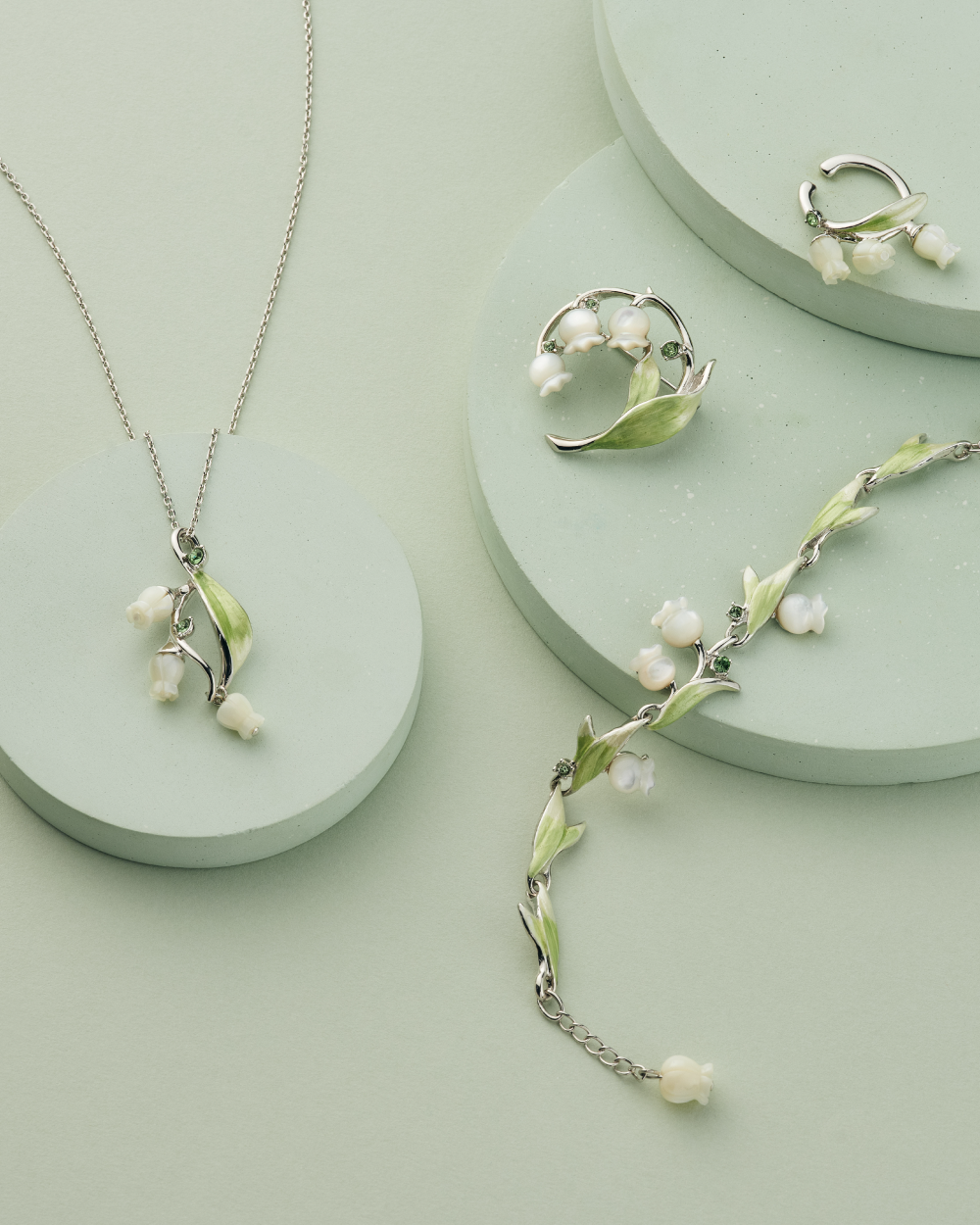エクリュホワイトの花と上品な色合いのグリーンの葉が、優しい春の訪れを感じさせる、すずらんモチーフのアクセサリー。
